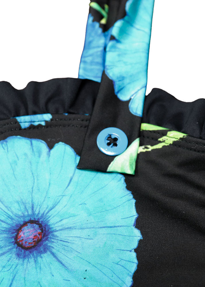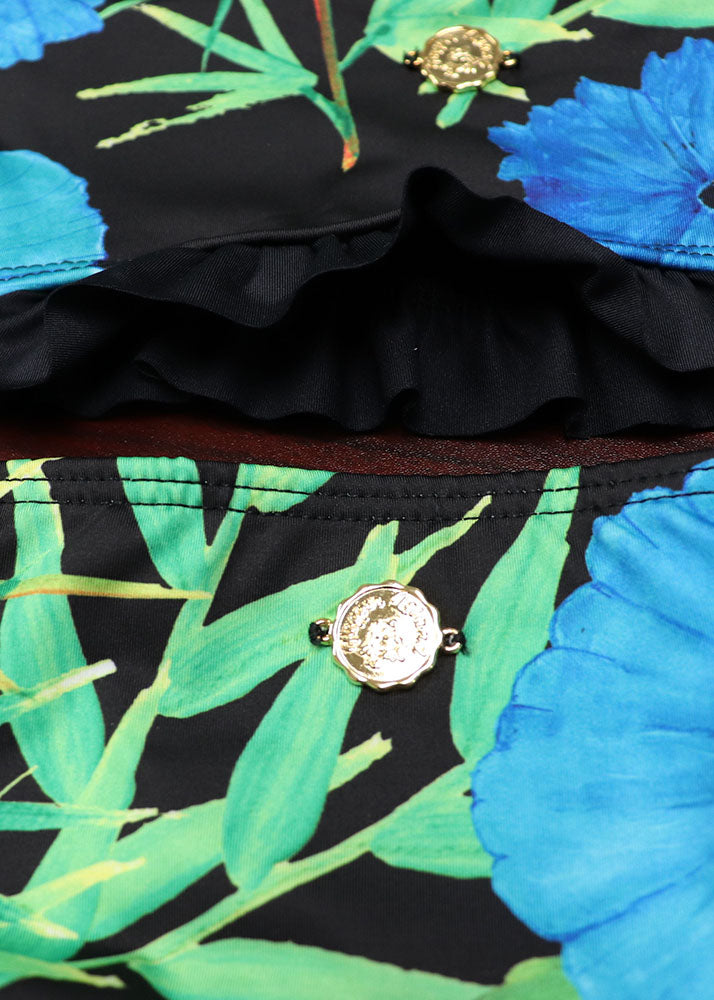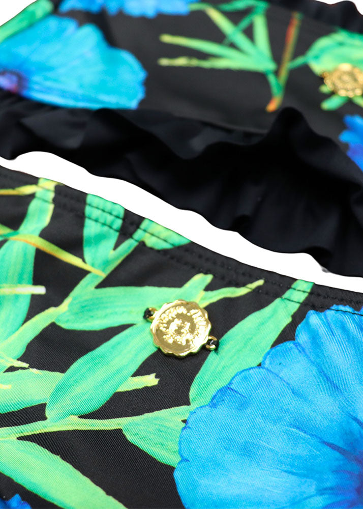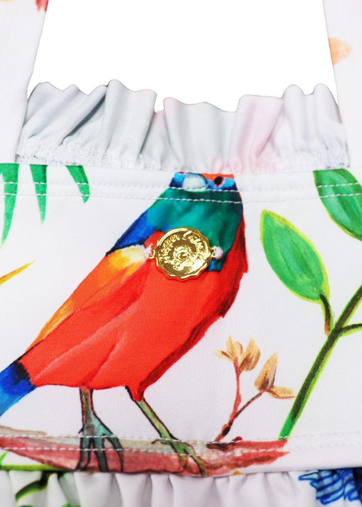 - Featured in signature tropical prints: Hummingbird/Hummingbird Ruffle, Hibiscus Flower/Ink-Black ruffle