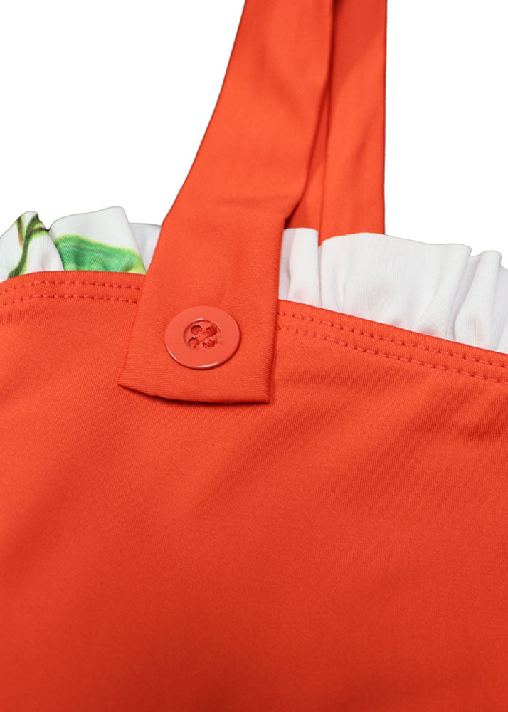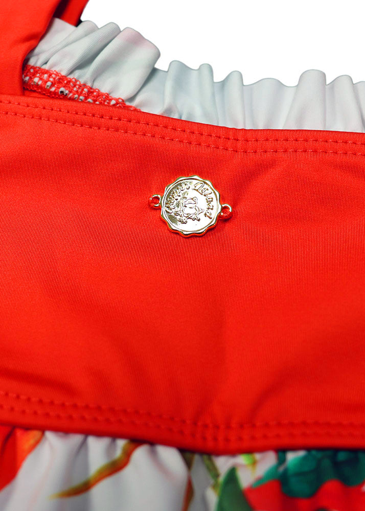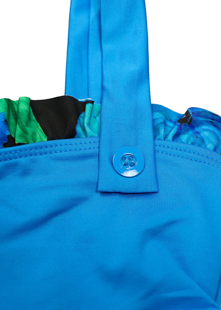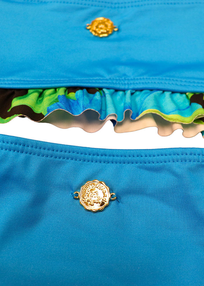 - Offered in solid colors: Azalea-Red/Hummingbird ruffle, Reef Blue-Aqua/Hibiscus Flower ruffle