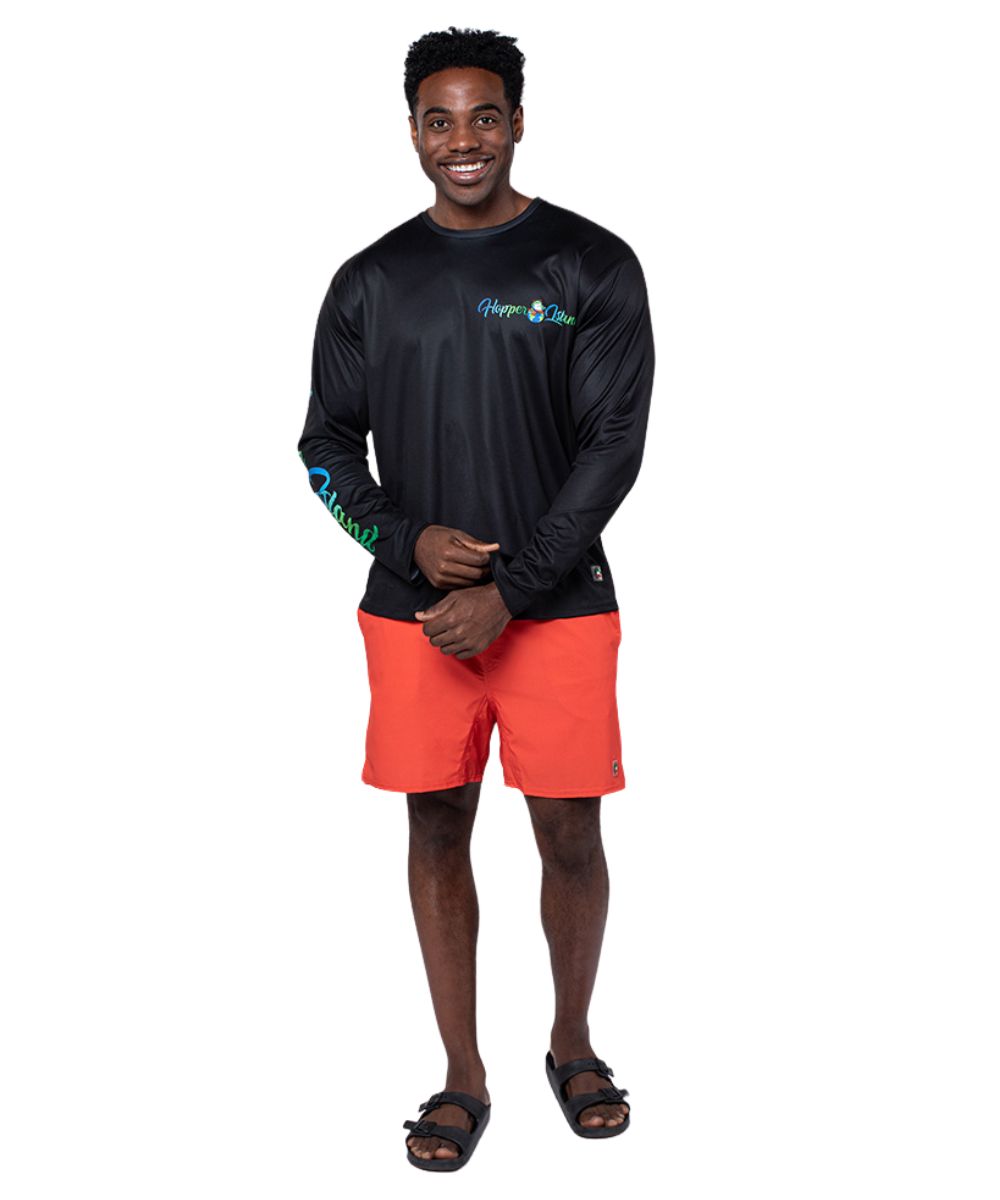 Our long-sleeve rashguard offers SPF 30+ protection to shield your skin from harmful sun rays during outdoor activities. Made from high quality breathable, quick-drying recycled polyester, it ensures both comfort and safety on sunny days. With a relaxed fit for ease of movement, it's perfect for beach, pool, boating and fishing. Adorned with our mascot River and the Hopper Island logo on the chest and arm, and featuring the Hopper Island name on the neck, it embodies the essence of the Hopper Island Life. Complimenting styles available for the whole family!